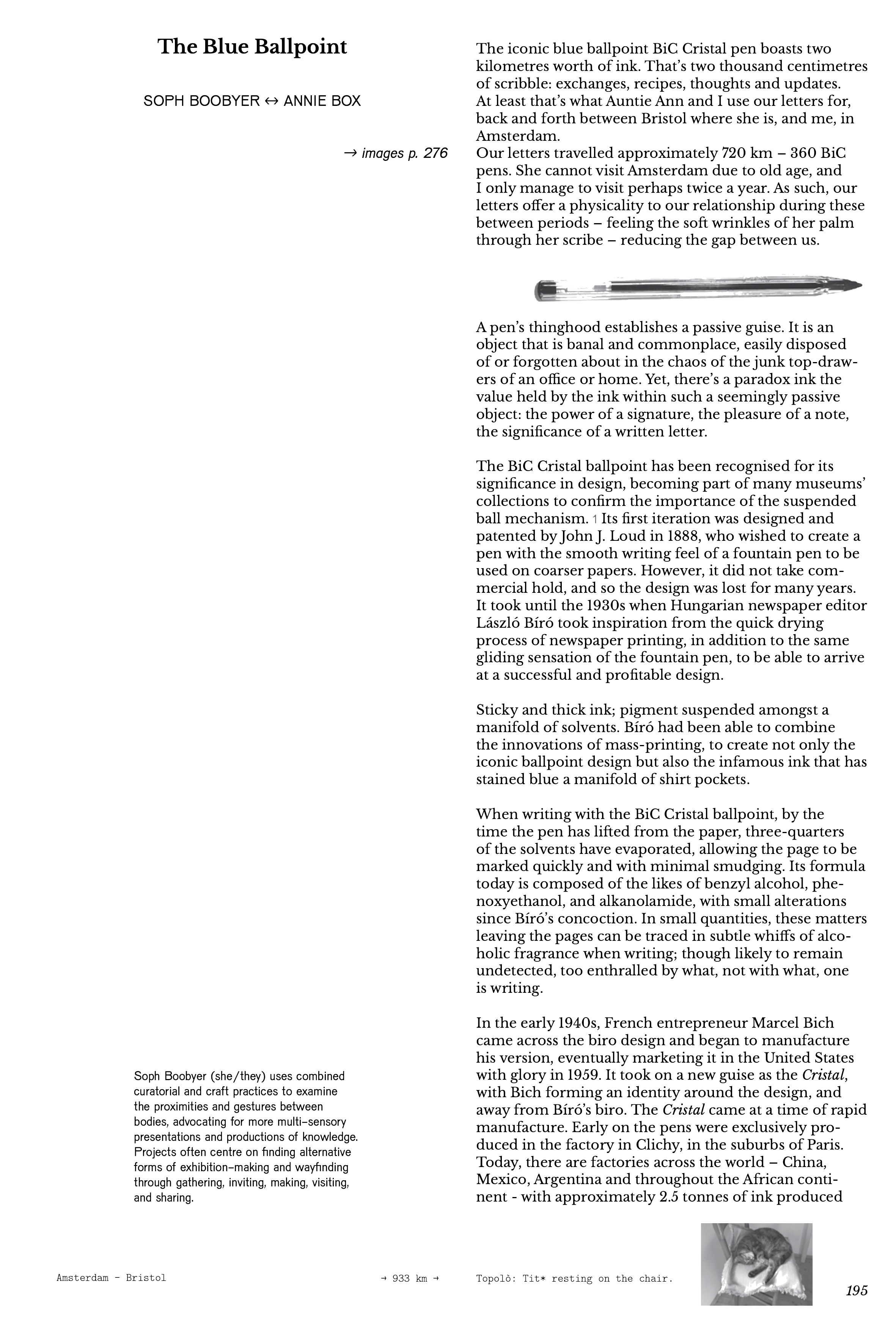 In a world where “there is no Away”, 6 the 150 billion BiC Cristal pens, if not aloof in the back of the junk drawer, exist and degrade without a seemingly perceivable trace. Ahmed’s thoughts on Queer Phenomenology and the notion of “(re)orientation" 7 previously quoted, shed light on how the entanglement of body and object “apprehend this world of shared inhabitance, as well as “who” or “what” we direct our energy and attention toward”. 8 What would it then be like to confront oneself with 2 km of ink in a given moment? The exercise with which this text started in writing back and forth with my Auntie Ann might have even exasperated the phenomenological feeling I hoped to reduce. The pen, now empty, has brought her thoughts closer to me through the total of four letters (still, to say, with a small amount of ink to spare - at a guess 500 cm?), with the legibility of that 2 km as a whole to remain at a loss.