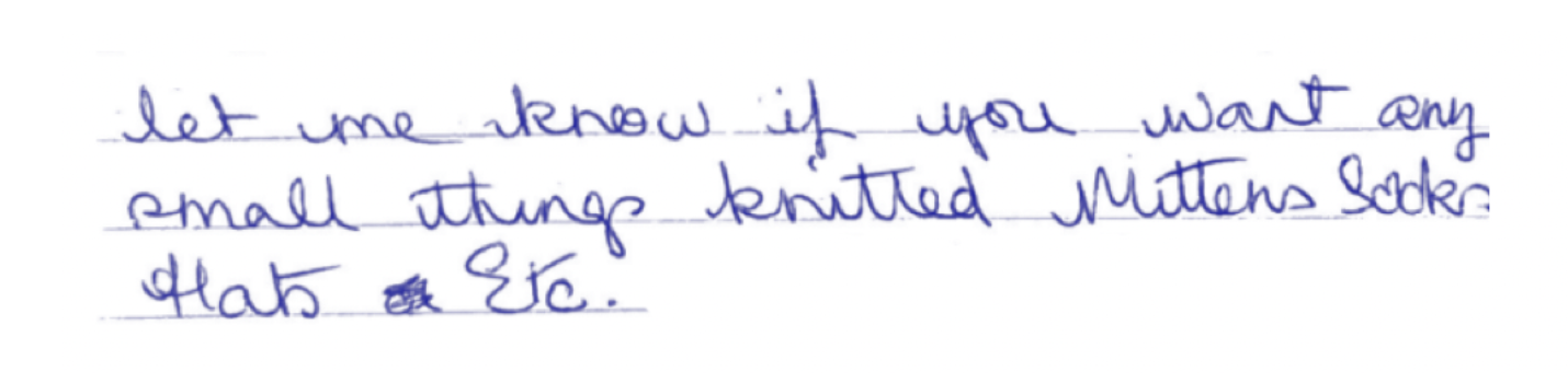 Let me know if you want any small things knitted. Mittens, socks, hats, etc.