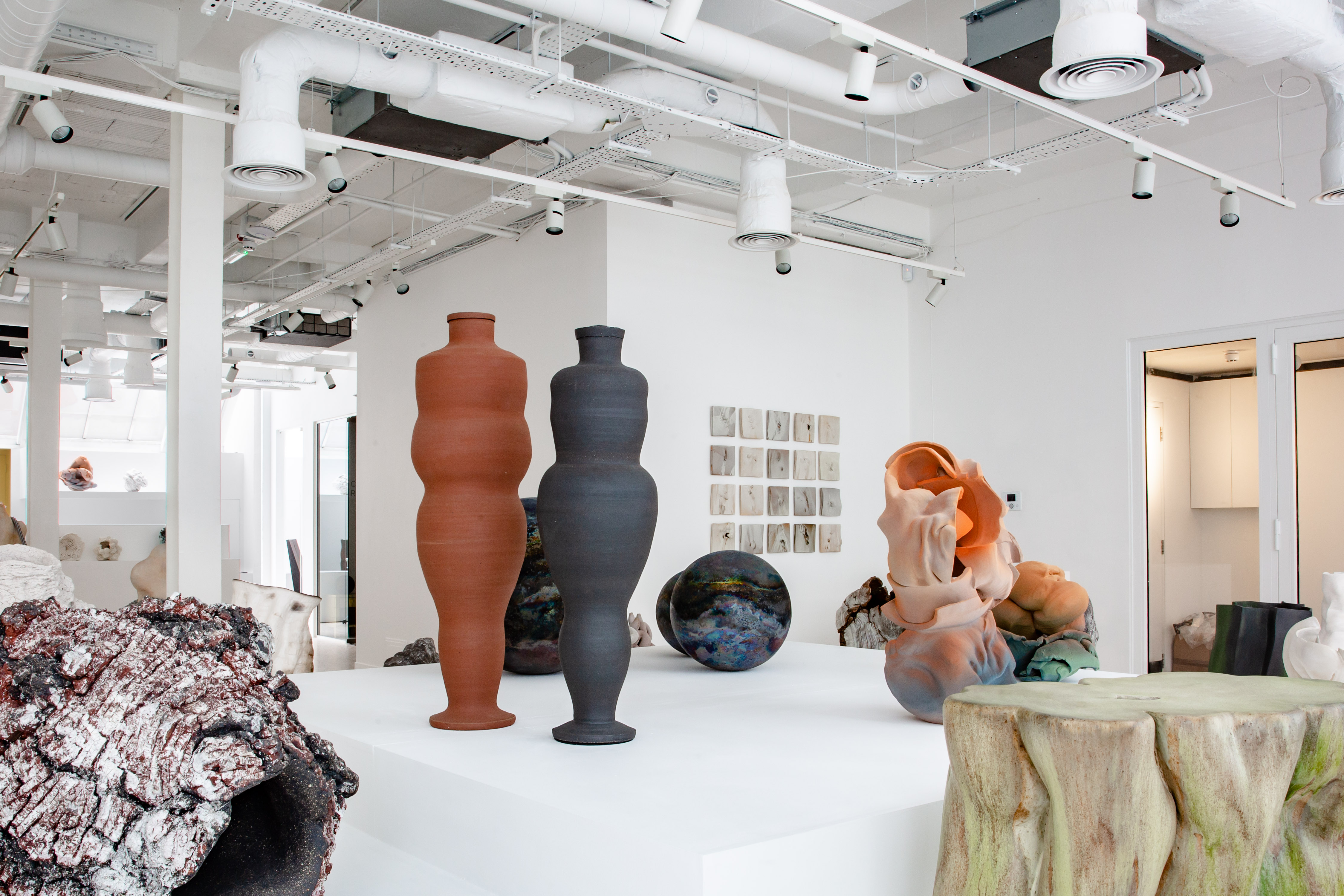 The artist's bodily impulses towards the physical takes form throughout the show, in sculpture, deconstructed vessels or wall pieces, each offering somatic and fleshly semblances. At the same time, they allude to the unique figures of the artists who make them, covered in layers of engobe and slurry, each with their own gestural inclinations and shaped by surrounding environments.